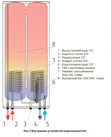 - Встроенный теплообменник из нержавеющей стали AISI 316. Благодаря ее высоким показателям твердости, трубка теплообменника не подвержена проявлению дефектов во время изготовления теплообменника (не «гофрит»). Как следствие — исключаются шумы и сопротивление в трубке теплообменника, а также ее механический износ;