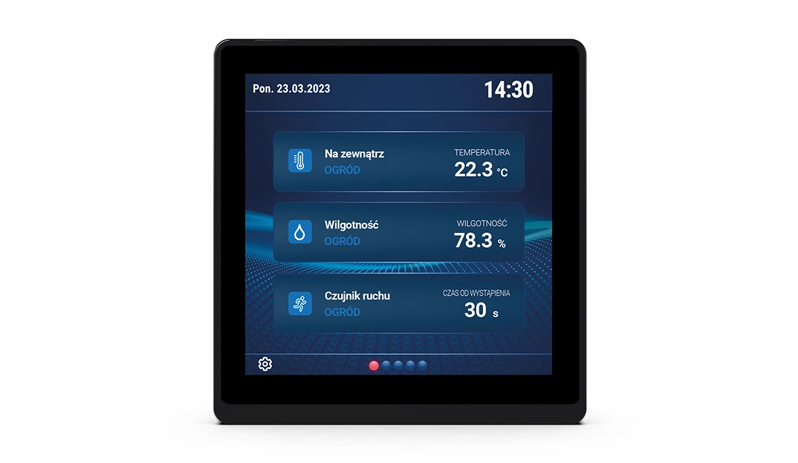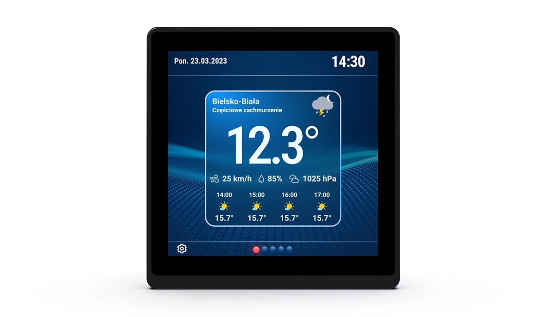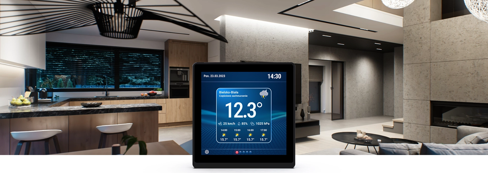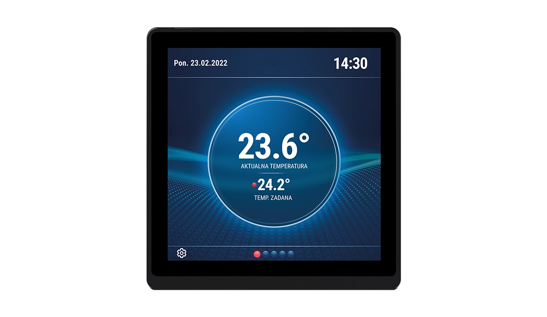 Пульт управления CP-04m является многофункциональным устройством. С его помощью можно отображать текущий прогноз погоды, проверять температуру в помещении (с возможностью подключения датчика температуры воздуха и датчика температуры пола), настраивать ярлыки для избранных сценариев, а также использовать его в качестве выключателя (при использовании любого реле, установленного в системе Sinum). Таким образом, пульт выполняет функции метеостанции, терморегулятора, информационной панели и выключателя. Всё это управляется с помощью 4-дюймового цветного сенсорного экрана, на котором можно отображать до 5 экранов и экран ярлыков. Связь с центральным блоком Sinum EH-01 осуществляется по проводной шине TECH SBUS. Устройство доступно в чёрном цвете. |