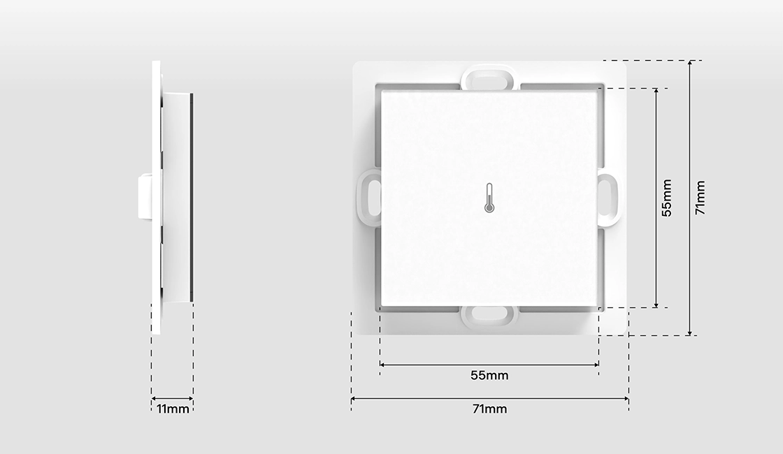 Размеры устройстваНаши стеклянные устройства устанавливаются в специальные стеклянные рамки с монтажным отверстием 55x55 мм. Эти точные размеры позволяют устройствам идеально вписываться в стандартные монтажные коробки, обеспечивая эстетичный внешний вид и идеальную посадку. Размеры детали