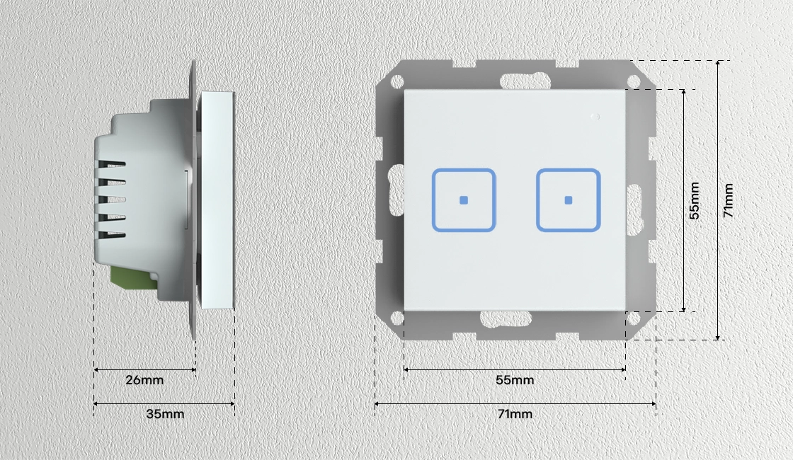 Размеры устройстваНаши стеклянные устройства устанавливаются в специальные стеклянные рамки с монтажным отверстием 55x55 мм. Эти точные размеры позволяют устройствам идеально вписываться в стандартные монтажные коробки, обеспечивая эстетичный внешний вид и идеальную посадку. Размеры детали