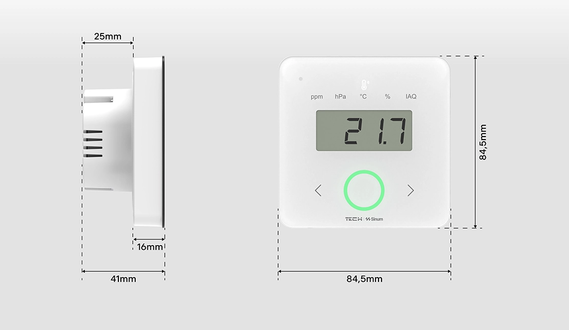Подключив MC-02 к блоку управления Sinum, вы сможете управлять другими устройствами вашего умного дома. Каждый параметр можно использовать в отдельных режимах автоматизации или назначить сценам. Устройство устанавливается в распределительную коробку шириной 60 мм, питается от сети 230 В, 50 Гц и взаимодействует с блоком управления Sinum по беспроводной связи. Кольцо подсвечивается RGB-светодиодом, цвет которого меняется в зависимости от текущего качества воздуха. |