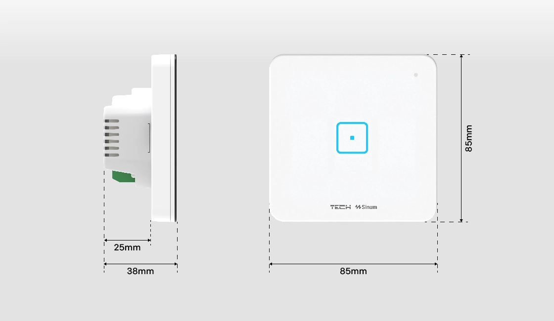Размеры устройстваСтеклянные приборы серии Single компактны и идеально вписываются в цельный стеклянный фасад. Благодаря точно подобранным размерам приборы идеально помещаются в стандартные монтажные коробки, обеспечивая эстетичный внешний вид и идеальную посадку. Размеры детали