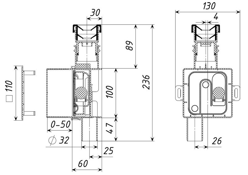 При сливе дренажа от кондиционеров вода проходит через съемную кассету, герметично соединенную с корпусом с помощью эластичных уплотнительных прокладок. Кассета имеет гидрозатвор высотой 50 мм и механическое запахозапирающее устройство в виде шарика, который при высыхании гидрозатвора не пропускает запахи из канализации.
