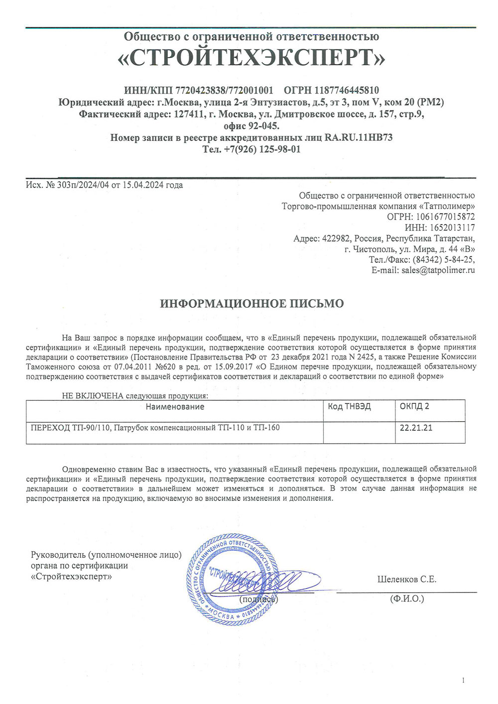 ОписаниеПатрубок компенсационный устанавливается в систему внутреннего водостока для компенсации температурных расширений трубопровода. Патрубок компенсационный представляет собой прямой отрезок трубы, верхняя часть которой является раструбом с уплотнителем, а нижняя предназначена для раструбного или сварного безраструбного соединения встык, либо электросварной муфтой. Технические характеристики