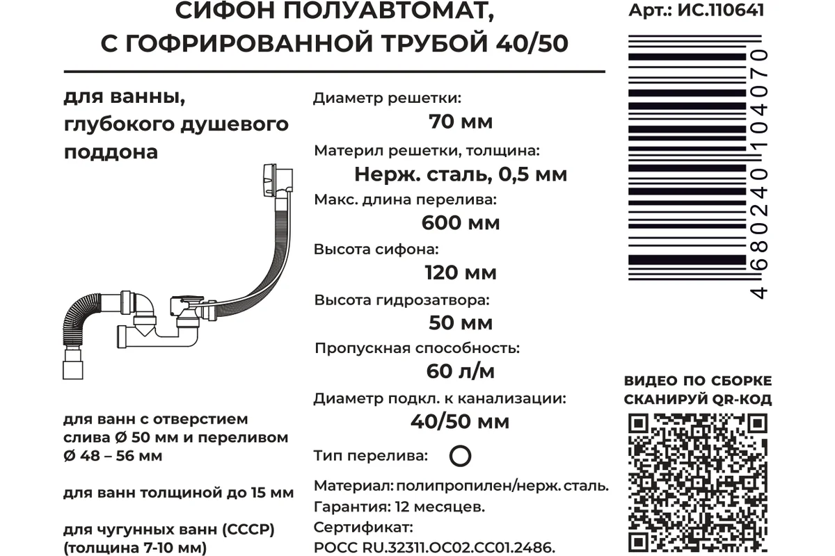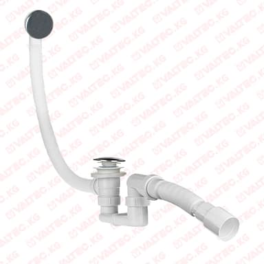 Сифон подходит для ванн с отверстием слива ⌀ 50 мм и переливом ⌀ 48-56 мм, включая чугунные ванны СССР с толщиной 7-10 мм и ванны до 15 мм. Оснащён полуавтоматическим донным клапаном для удобного закрытия слива. Диаметр выпуска 50 мм идеально подходит для большинства стандартных ванн и поддонов.