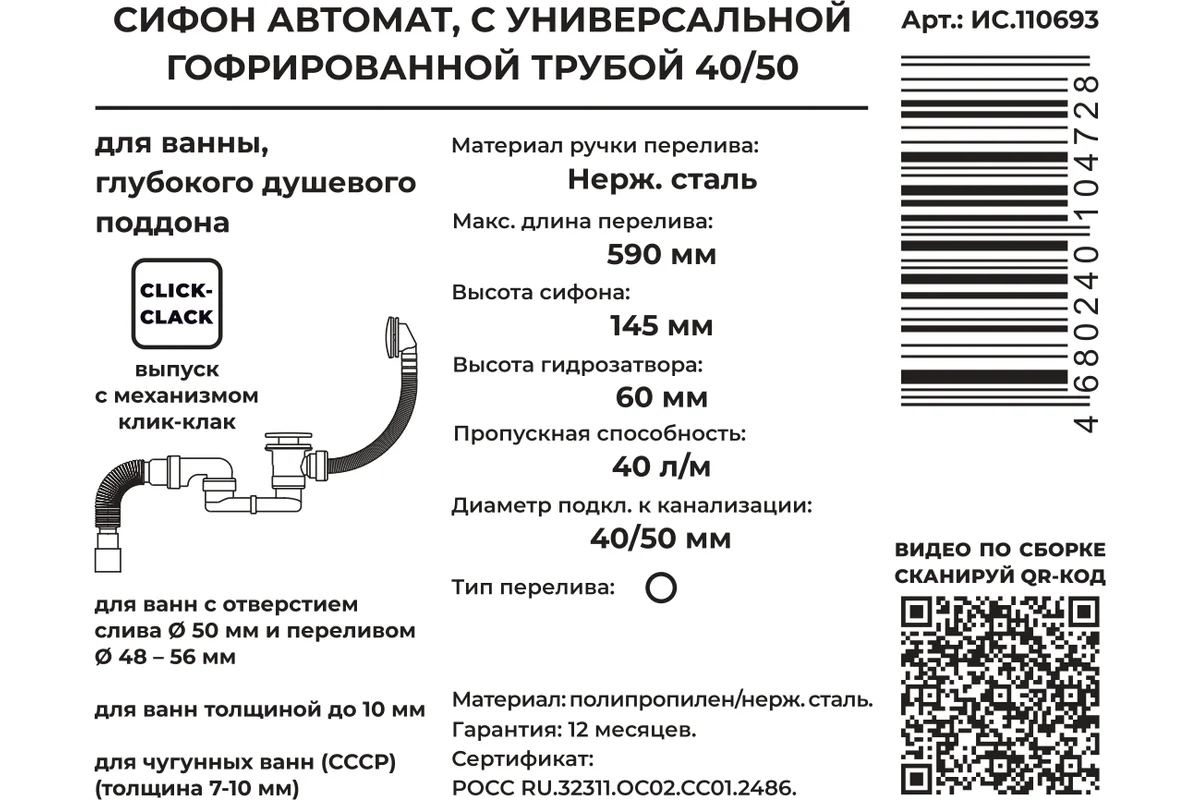 Сифон для ванны и глубокого поддона Masterprof автоматический с гибкой трубой 40х40/50 — это надежное и эффективное решение для правильной работы слива и перелива в ванной или душевой кабине. Он обеспечивает защиту от неприятных запахов и утечек воды, идеально подходя для ванн с отверстием слива ⌀ 50 мм и переливом ⌀ 48-56 мм, включая чугунные ванны СССР с толщиной 7-10 мм и ванны толщиной до 10 мм.