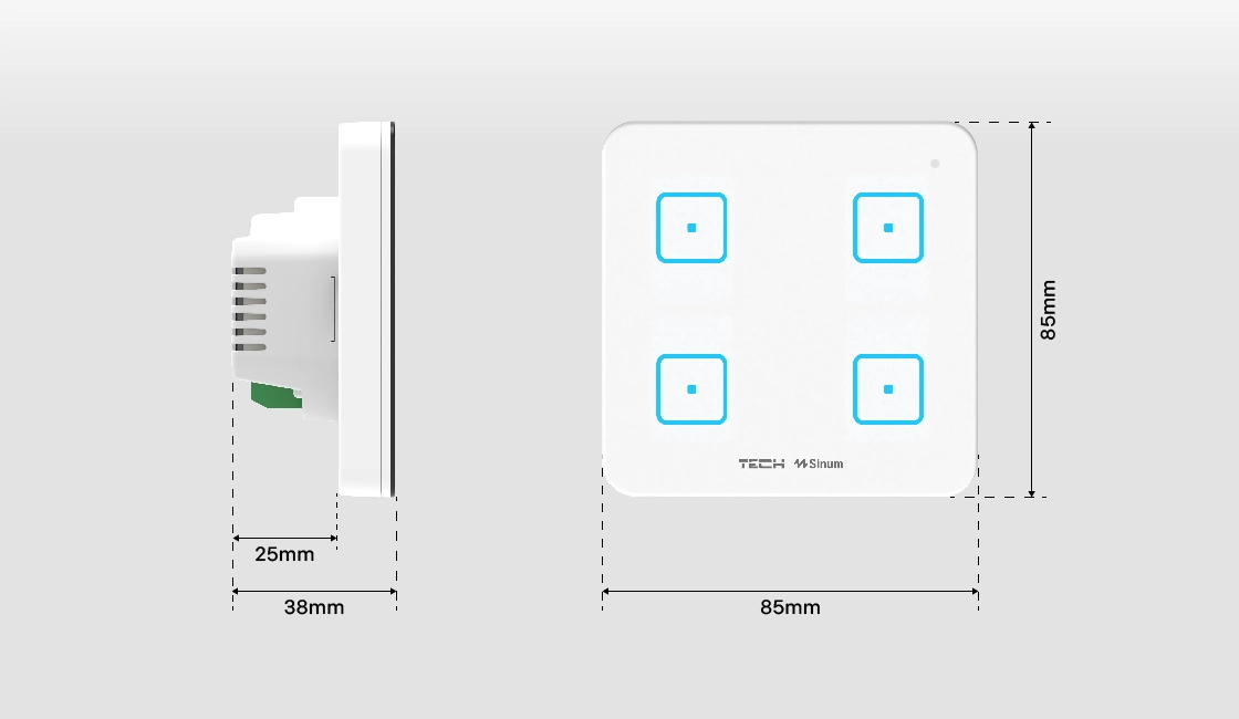 Размеры устройстваСтеклянные приборы серии Single компактны и идеально вписываются в цельный стеклянный фасад. Благодаря точно подобранным размерам приборы идеально помещаются в стандартные монтажные коробки, обеспечивая эстетичный внешний вид и идеальную посадку. Размеры детали