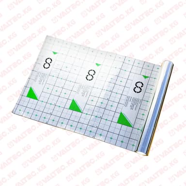 Фольга это ламинат полиэтиленовой и полипропиленовой фольги, оттенка серого металлика, металлизированная, с напечатанными на верхней стороне непрерывными, пунктирными или точечными линиями, образующие клетку с боками 10 см. Фольга толщиной 0,13 мм поставляется в виде ленты шириной 120 см., свернутой в рулон.Фольга предназначена для использования при укладке напольного отопления, для защиты плит из пенополистирола от влаги цемента, при прокладке на них верхних слоев пола. В рулоне 50м.