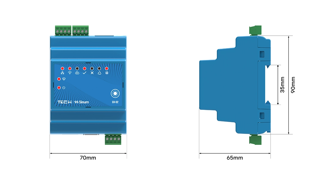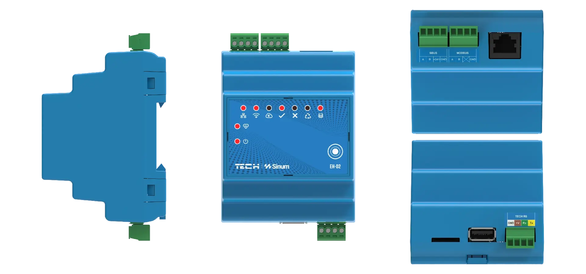 | Блок управления EH-02 собирает и обрабатывает информацию с внешних устройств и исполнительных механизмов, позволяя просматривать и изменять их рабочее состояние из домашней сети или через облачный доступ. Устройство также позволяет создавать автоматизацию на основе подключенных устройств и собранных с них данных. Кроме того, оно позволяет создавать сценарии и расписания. Блок устанавливается на DIN-рейку, питается от 24 В постоянного тока и имеет следующие входы: 1x USB 2.0, слот Micro SD, 1x RS-485 (SBUS), 1x RS-485 (MODBUS), сетевой интерфейс RJ-45, Wi-Fi и 1x TECH RS. | ![]() |