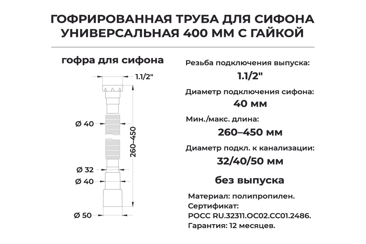 Гибкая гофрированная труба может быть использована как гофросифон, при этом для этого нужно отдельно приобрести выпуск с резьбой 1.1/2". Трубка для сифона имеет минимальную длину 230 мм и максимальную длину 400 мм, что дает возможность подстроить её под различные условия монтажа.