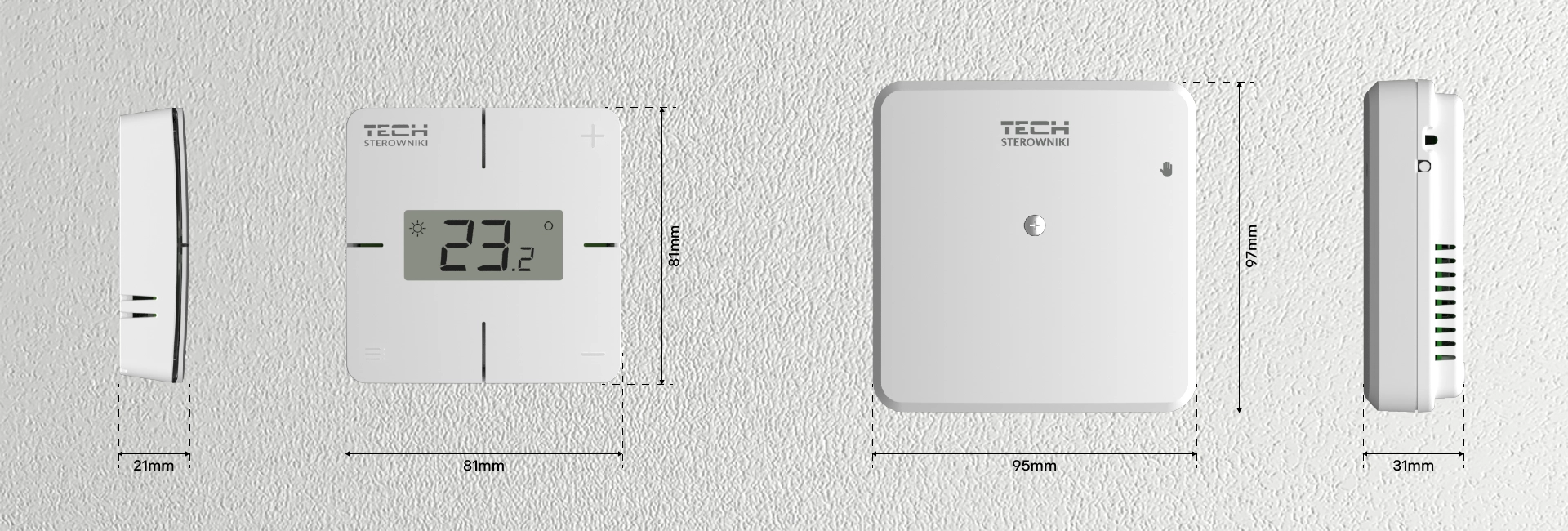 Регулятор температуры оснащен датчиком температуры воздуха, датчиком влажности воздуха и возможностью подключения датчика температуры пола. Интуитивно понятный дисплей отображает информацию о текущей температуре и позволяет пользователям изменять желаемую температуру в помещении. Он имеет механические кнопки и ЖК-экран без подсветки. Соединение с модулем управления осуществляется по беспроводной связи.